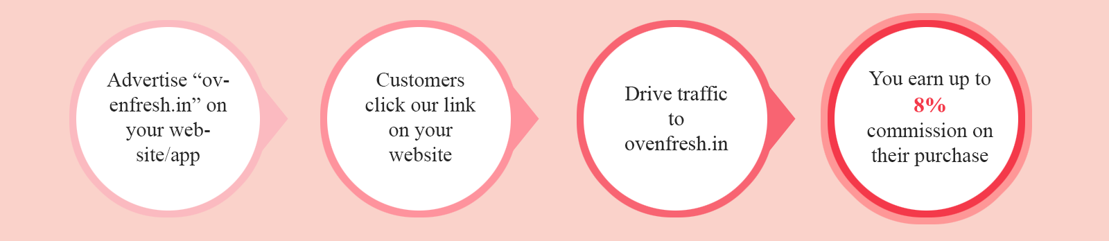 Ovenfresh Affiliate Program is a great way for you to earn commissions by placing product banners or links on your website to refer users to the ovenfresh.in website. You can earn up to 8% every time a user clicks on the banner/link and makes a purchase on our site.